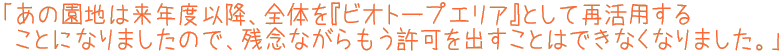 しかし、その後管理者さんと個人的に連絡を取ったおとうから、「何だかもうキャンプはできなくなるみたいだよ」という悲観的な見通しが伝えられました。そして2010年の年始休み明け、Takemaが管理者さんに連絡を入れたところ、次のようなお返事をいただいたわけであります。