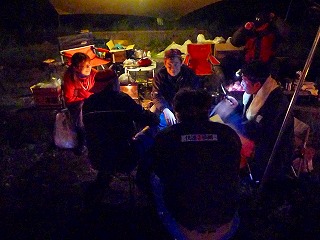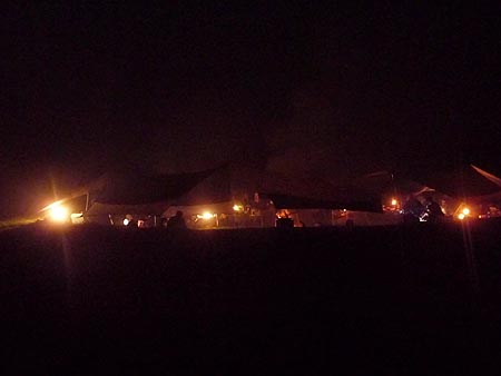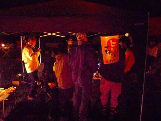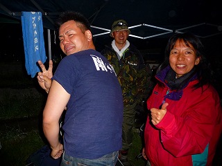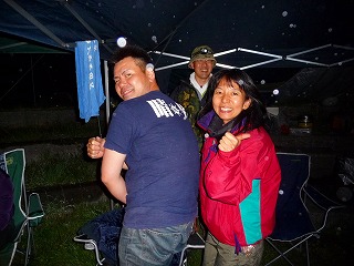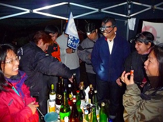 夜のとばりがすっかりと降りたころ、各宴会ブースは着々と盛り上がりを見せていくのであります。特に、皆さんの持参したお酒を一堂に集めたアルコール配給所である「中央テント」は、お酒を求めに集まった皆さんが集結してしっかり立ち飲みコーナーに早変わり。その居心地の良さに、その場で爆睡してしまった某氏までいたくらいです(右上画像マウスオン)。こらこら皆さん、いたずらしちゃダメよ(左上画像マウスオン)。