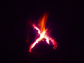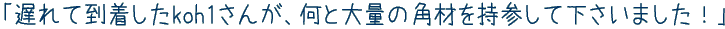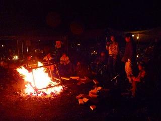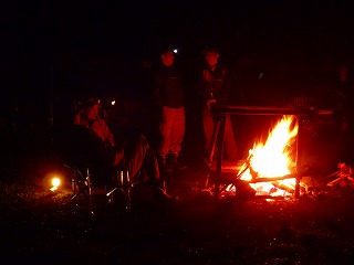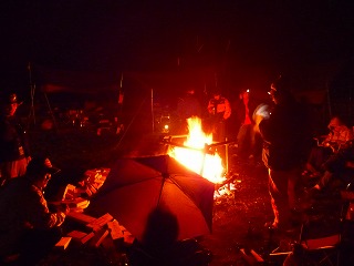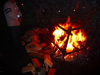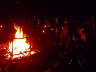 焚き火周辺に置かれた大量の角材が、新たな宴会焚き火の種として持ち込まれました!となれば夜も更けてきて寒くなってきたところですから容赦なく大量投入!参加者の皆さんも一斉に火の周りに集まって来たことは言うまでもありません。koh1さん、ありがとうございました!