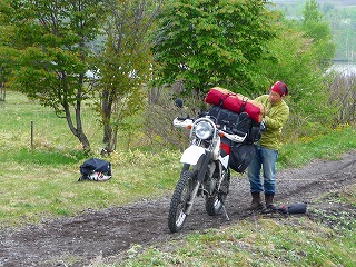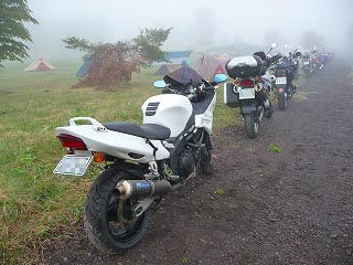見る間にタープもテントもなくなり、そのかわり各バイクのリアシート部分が賑やかになってます。
