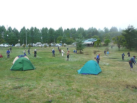 明けて翌朝、バラギの草原は霧の中にありました。とはいえ霧雨はほぼやんでおり、まぁまぁのお天気といったところ。しかし朝は寒かったぞ、ある人の計測によると「今の気温、4度だよ4度!」ということでした(笑)。わたしは7:30頃に起きたのですが、実は昨日のうちに聞いていたとおり、8:00になると草刈り機のエンジンが一斉始動!まだ寝ていた人も「あれー、何か始まったよー」と目を覚ましたのではないでしょうか?(だからというか、お寝坊さんは誰もいませんでした)