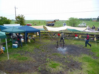 居住区(テント村)と生活区(サークルタープ)の全景。知らない人が見たら「何だこの団体は?」と思うこと請け合いでしょう。