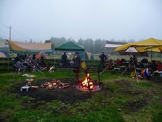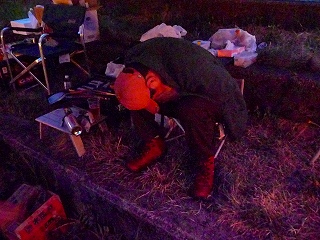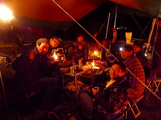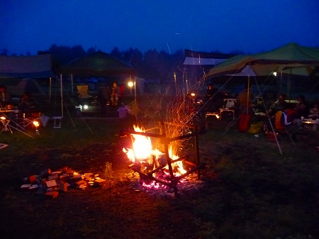 そんなわけで参加者各氏のご挨拶は続きますが、それが終わる頃にはさすがに暗くなってきました。しかし薪はたんまりあるし、皆さんの内燃機関はまさに「火が入って」パワーアップしているし何の問題もありません(笑)。ちなみにこの日は夜になっても気温が下がらず、何とTakemaはずーっと半袖1枚で飲んだくれていたのです。標高1300−1400mの、天気のよくない夜のバラギでですよ!これには自分ながらちょいとビックリひょうたん島でありました。