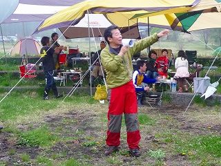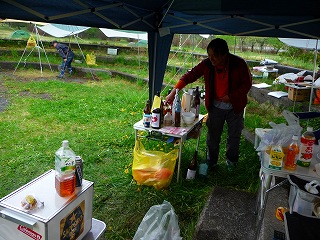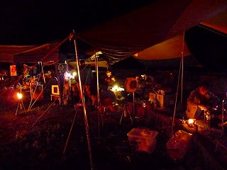 そしてそのあとはそれこそ各ブースでのんびり飲み会が始まるわけです。うーむこの円形サークルがもう少し小さいとブースごとのコミュニケーションが図れていいんだけれどなぁ(かつてのTakemaオフ@猿ヶ京はその点全てが近かったっけ、でも今は利用不可能ですが)。もっともサークルが小さければ小さいだけ焚き火の火による「タープ穴あき事件」が多発するような気もします(笑)。