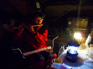 中央テントの隣では濃厚なる湯話が繰り広げられており、中央テントではおしんこどんの篠笛&笛トライアル。皆さん四苦八苦?