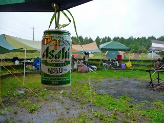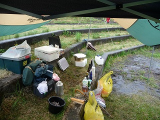 左上画像ではタープに雨がたまらないよう缶を重しとしてぶら下げてありますが、そのヒモを伝って雨水が勢いよく流れ落ちているのがわかります。あーあこんな中で撤収かぁ、雨、止まないかなぁなどと空を見つめて願ったりもしますが、折しもこの日は台風2号が接近中ですから今後風雨が強くなることはあっても天候回復などは望むべくもないのでありますよ。あーあ。