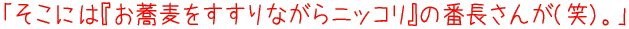 ほぼわれわれと入れ替わりのタイミングでしたが、こういうのも何だか嬉しいパターンです。お互いに向かいの洋風スイート施設には目もくれずに蕎麦屋直行という発想もそっくりだったりするわけですからね(笑)。