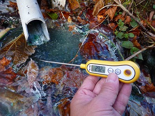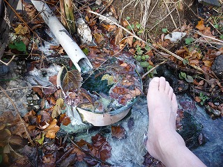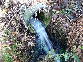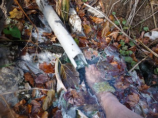 | こ、これはコレハ!しかし斜面の途中ゆえ湯はそのまま斜面を流れ下るのみでそこには湯だまりスペースが存在しませんし、「先人の先人による先人のための加工工事」の跡もありません。ということはここでこの源泉に「浸かる」ことはできないのか?となれば残された道はといえば‥ |