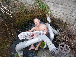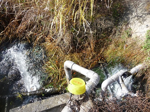 | そういえば途中いくつか寄り道してましたんで、場所はともかく画像だけご紹介。上画像は施設跡なのだそうで、今もこんこんと自噴湯が流されるままになっている‥のですがちょっと温度が低いですね夏向きですね(あのね)。何でも師匠は源泉所有者さんをご存じなのだそうな? |