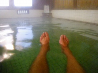 この日は平日でしたが農閑期のお年寄りには平日も休日もないということなのか、先ほどのりんご温泉同様「どっしりと構えた御方々」が(笑)。ただし内風呂の方が熱めだからなのか長湯にはあまり人気が無いようで、皆さん続々と奥の「眺望風呂」へと吸い込まれていきます(あっちのほうがぬるい)。これは‥撮れるか?ということで急いで脱衣場に舞い戻り、とりあえず右上の湯足画像を1枚だけ撮ったところで次のお客さんがやってきて「撮影タイム瞬時に終了」(笑)。まぁ1枚だけですが撮れただけ良しとしましょう。ちなみに湯の色は日によって違うようですがこの日はご覧のとおりのエメラルドグリーンでありました。 しかしこの湯は強食塩泉ですからしょっぱいのはもちろんですがそれよりも強烈な苦さが印象的です。りんご温泉はいわゆる「甘塩系」でしたがこっちは「さらに塩味を強くして、ついでにニガリも入れちゃったからね!」という感じでぶったまげました。ゆえにというか、りんご温泉以上に湯上がりの汗が引かず難渋しましたが、まぁそれでもこの時期ですから外にいれば強制冷却されるのでありがたいです。夏はキツイだろうな(笑)。 |