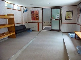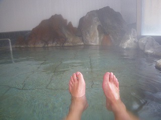 「お風呂ですか?はいどうぞいらっしゃいませ!」ととても明るい応対をしてくださった女将さん(若女将さんかも?)に料金を支払って脱衣場へ。うはー何だか広いぞ!はめ込み式の脱衣カゴに服を入れていざ浴室へと向かうわけですが、脱衣カゴ周りにはどうやら温泉を利用した床暖房が仕込まれているみたいだし、浴室の IN &OUTにはほんの10歩くらいとはいえ微妙に距離があるので、特にOUT時には途中に敷かれたマットで足裏の水分&湿気もしっかり吸われると思われるなかなかの造りです。で、いざお風呂へと向かいます! |