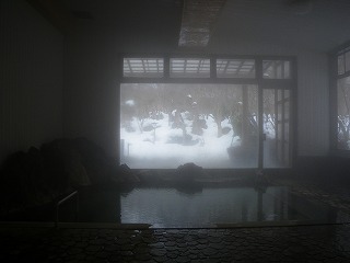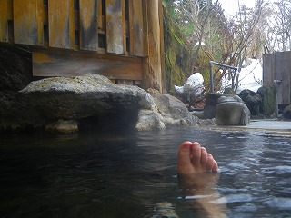 続いては内風呂からそのまま出られる露天風呂へ。ぐわぁ寒い!(笑)。というわけでさっさと浸かりましたが「ん?内風呂と浴感が変わらないんですが?。これもしばらく前のレポートだと「内風呂は独自源泉、露天風呂は含硫黄系の別源泉」ということでしたが、現在は全浴槽とも独自の「花渕荘源泉」を利用しているようです。湯触りでわかるようになったんですからTakemaもだいぶ大人になったなぁ(何だか前のページと言っていることが違うような気がするのはたぶん気のせいです)。 |