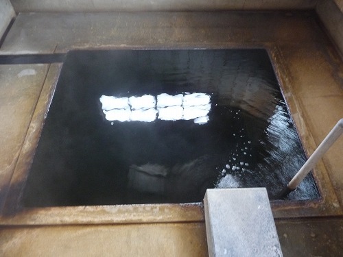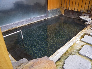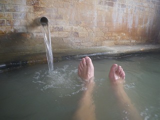 川渡温泉界隈で比較的長くうろうろしていたせいもあり足先などはすでにかなり冷たくなっておりました。かけ湯をしても最初はアチチ、でもそれがいいんですよ。大事なところ洗いのあと浴槽縁に座って頭から湯をかぶること約10回、うん、これで浸かれるかなと「満を持して」湯に浸かります。 |
