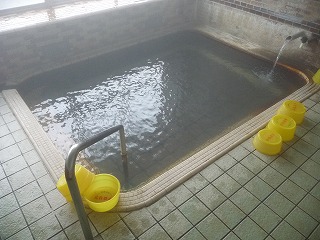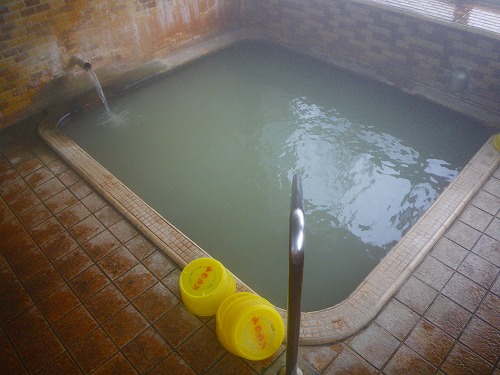 奥の浴室に入ってみると、うす緑の濁り湯がお出迎えっ!女将さんによると「溜め始める最初の時はもっと黒っぽいお湯なんですよ」とのことです。1号泉は単純温泉とのことですが、やっぱりいろんな成分が溶け込んでいるのはもちろんであり、それが炭酸水素塩泉との絶妙なるハーモニーだかバームクーヘンだかの結果このようなお湯のさまを見せてくれていることなのでしょう(何のこっちゃ)。ちなみにこの時点で床タイルは完全に乾いていましたから、確かにTakemaの一番湯説は客観的にも証明されたかも?(笑)。 そんなわけでいざお湯へ!浴感はさらり系というよりややキシ感ありで、臭いはといえばはっきりとした金気臭と土っぽい感じ+ややアブラ(笑)。口に含んでみるとやや塩+微苦味という感じだったでしょうか。3号泉オンリーと比べると何だかいろんなクセがあって楽しいですよぉ! |