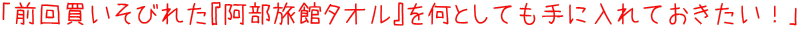 という一念でありました。そう、阿部旅館では若女将さんデザインによるオリジナルのマフラータオル(というのかスポーツタオルというのかよくわかりませんが)を販売しているのです。しかもどうやら「完売=企画終了」らしくて、こういう限定モノにはやっぱり弱いんですよわたくしTakemaは(笑)。とはいえわざわざ送っていただくというのも申し訳なくて‥と思っていたところで、数日前には考えてもいなかった鳴子入り=千載一遇のチャンスなのです! |