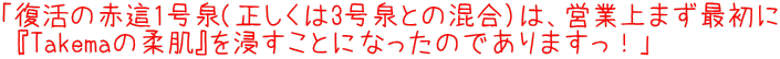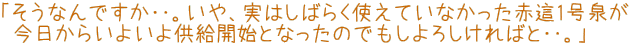 ちなみにこのやりとりをしていたのは画像の記録によると10:45ころ。女将さんは「今日の午前中に使えるようになった」とおっしゃっていましたからもしかして復活源泉の一番湯という僥倖ドドンパ大当たり?ちなみにあとで若女将さんとやりとりしたところ「まず間違いないでしょう!」とのことで‥ |