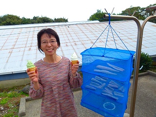 と手渡しされたのは、先ほどたべたあしたばソフトのミックスバージョンを「その形のまま冷凍庫で凍らせた」ものでありました(つまりは「ソフト」じゃなくて「ハードクリーム」というべきなのか)。そんなわけで、脇の駐車場でわしわしと食べちゃいました。物干し台にはご覧の通り春トビ(ウオ)が干されており、ん?でも確か先ほどの女性は「この時期になるといろんなところから『はい、ハルトビ!』って回ってくるからね、飽きちゃうんだよね」というようなことをおっしゃっていたような‥おそらくはこれもそういう流れで回ってきたのでしょうね。