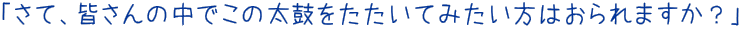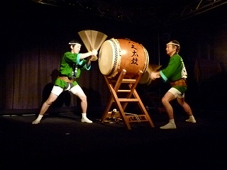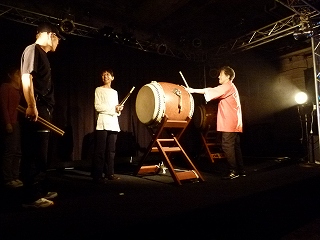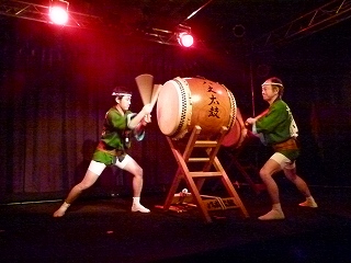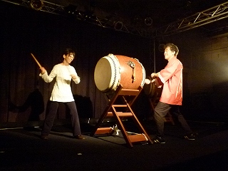 | ちなみにこのお2人は司会進行&補佐のお2人でして、それでもこのお2人の太鼓だけでインパクトありありです。なおこの日のお客さんは1.2..確か8人くらいだったかな、ちょっとサビシイ「八丈太鼓ナイト」の幕開けとなりましたが(ちなみにこの日3/20から4/7まではぶっ通しでナイトライブをやるということでした)、さすがに初日ということもありお2人もちょっと緊張なさっていたような? さてオープニング太鼓のあと、司会の方がやはりというかそうくるかというか、次のような提案をなさいました。 |