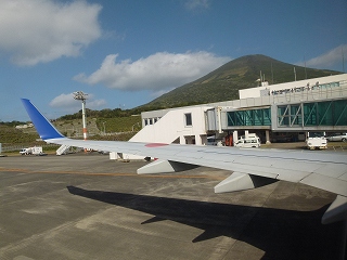 | というわけでいよいよ羽田行きの折り返し第1便は間もなく島を離れます。機内から眺める八丈富士の天気は上々、きっとこの同じ時間にはこわっぱさんもどこかの湯に浸かりながら快哉を叫んでおられることでしょう(笑)。 |