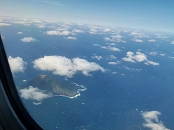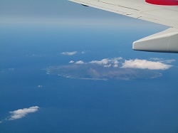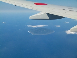 | シートベルト着用のランプが消えたのは比較的早く、眼下にまだ八丈小島(左上画像)が見えていることでした。やがて今回行かれなかった御蔵島(中央)、そして三宅島(右上)と順々に見えてきました。またいつか来るからねー、特に三宅島くん、すぐに来ないからといって怒って噴火なんかするんじゃないよ、そうしたらもっと長い期間来ない(来られない)からねーっ! このあとさらに式根&新島、さらにはずっと遠くの方に富士山なども見えていましたがここでは省略。飛行機はたった45分足らずで東京都亜熱帯区から大田区の羽田空港に到着してしまいました。 |