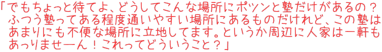 | で、ここで不思議に思ったのがこの公園と道路をはさんだ山側にぽつんと立つ2階建ての建物です。左上画像にマウスオンしてもらうとわかりますが、その建物の側面には大きく「塾」と書かれているではありませんか! へぇ、八丈島にも塾があるんだ、そりゃまぁ考えてみればあたりまえなのかも知れないけれど、でも個人指導っぽくない本格的な建物だしこんなところ‥と、そこまで思ったところで新たな疑問が。 |