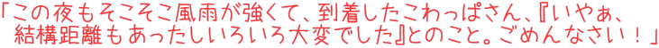 で、この件については当該ページにてアップしてありますのでこちらをご覧いただくとして、実はその後も掲示板等に書き込みをいただいていた「こわっぱさん」が、何とこの日八丈島入りしたというのです(このお天気ゆえ飛行機の運航が危惧されましたが「条件付き出発」ではありながら無事着陸したとのメールをいただいておりました)。 ただ、いかんせん夕食はもう頼んじゃったので居酒屋で宴会というわけにもいかず(というか肝心なTakemaが飲めないんじゃしょうがないっしょ)、しかも今夜は八丈太鼓ライブ‥ん? |