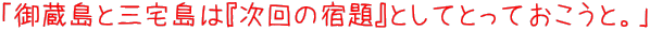そんなわけで伊豆諸島南部編(といっても八丈島と青ヶ島だけですが)、これにて終了‥しないんです。もう1ページだけ「後日談編」に続きます(いつもの通りネタを引っ張るTakemaです(笑)。 |