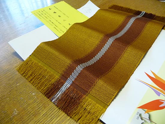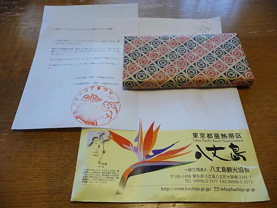 | あのスタンプラリーですが「期間中、14箇所のうち5箇所のスタンプを集めて応募した方々のうち抽選で100名の方に記念品贈呈」と公式サイトには記されていました。ただしスタンプシートには賞品名として「黄八丈テーブルセンター」と書かれておりましたが、たぶんランチョンマットみたいな感じなのかなぁとTakemaは勝手に推測しておりまし(文化的レベルの貧困さ丸出しですが)。 で、「100名かぁキビシイなぁ」と。ふだんこういう抽選モノにはほとんど手を出さなかったTakemaでありますが、今回は前述のようにおしんこどんと合わせてダブルコンプリートだったわけですからキビシイとはいいながらちょっとだけ(いや大いに)期待していたわけです。 。で、ある日こんなモノがポストに入っておりました。 |