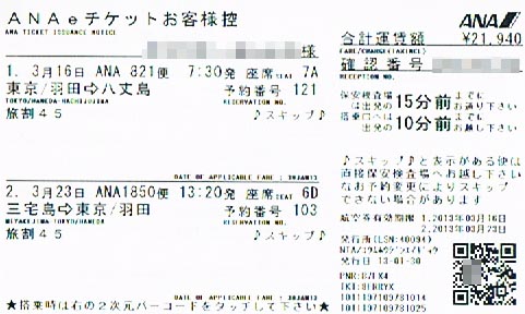 いやここであからさまに喜んじゃうのも三宅島関係者の方々にとっては失礼千万なのでありますが、これでかなりの額が戻ってくることとなり、八丈島発の正規チケット購入による持ち出しをそこそこ補填することが出来たわけです。助かったー! なおまだ現在進行形の段階(2013/5)ですが、現行ANAボンバルディア機の引退を機に三宅島便はANA(ANK)から新中央航空(調布から大島、新島、神津島便を運航中)による運航に切り替わる可能性が高そうです。 というわけで八丈島○○の方に大感謝っ! 続いてPart.2ね。 |