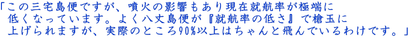 いやはやすごいぞ八丈島○○の係員さん!ちなみに三宅島路線(1日1便)の就航率は、時期にもよるのでしょうが伺った話によると直近のデータでは‥ |