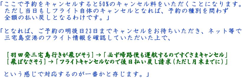 | 日々それぞれのお仕事において部下(時には上司)の仕事状況にチェックにキビシク目を光らせておられるはずの拙サイト読者諸兄であれば、本文当該ページに「三宅島からの飛行機を予約済み云々」という記載があったことにお気づきだったかと存じます。 しかしわれわれが帰路に利用したのは八丈島発の羽田便でありまして、となると「すでに予約していて代金も払い込んでいた」三宅島発のフライトはどうしたのかというところが謎笑系なのす。 で、普通ならキャンセルしてオシマイなのですが、実はわれわれは「あえてキャンセルせず勝負に挑む」という修羅の道を選択したのです! というのも、「どこの誰かは言えないけれど誰もがみんな想像できちゃう」某御方からこんなアドバイスを受けたからなのです。いわく、 |