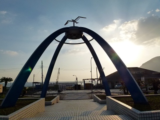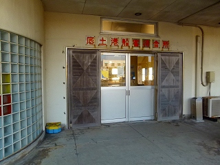立体オブジェは輝かしい島の未来を象徴するかのようですが、その一方で港の旅客ターミナル(船客待合所)はかなりローカルな感じで売店すらありません。ま、船は1日1便しか来ないわけだし、ターミナルのすぐ向かいにはおみやげ屋さんがあるので問題はないのでしょうが、ゆくゆくはリニューアルも必要でしょう。何といっても空港と並んでここもまた「島の顔」なのですから‥。 |