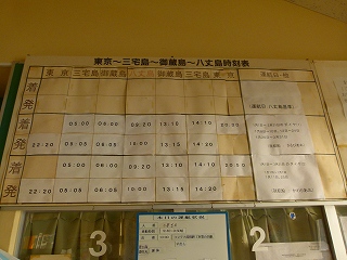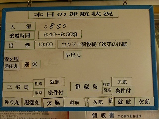 まだ早朝(7:00過ぎ)なので待合所内には誰もいませんでした(そりゃ当然。ちなみに待合所自体7:00にオープンしたばかり)。で、これまた時代を感じさせる時刻表(紙を貼ってるのね)、そしてその下には「本日の運行状況」が小さなホワイトボードに示されておりましたが、これがこの日これからの状況を示す最新のものなのか、それとも昨日の状況がまだ書き換えられていないだけなのかは不明です。できれば「何月何日 何時更新」って記載してほしいところ(関係者各位よろしくお願いします)。 なお待合室内にはひょっこりひょうたん島をモチーフにした顔出し看板がありましたが(ちなみに正式名称は?と調べてみたら、当然正式(公式)の名称はありませんでしたが、こちらの専門サイトに従い以降拙サイト内での表記は「顔出し看板」に統一します)、ひょっこりひょうたん島のモデルとなったとされているのはここ八丈島のほか大槌町の蓬莱島や瀬戸内海の瓢箪島とされており、いまだどれであると確定はされていません。ま、確定させるべき対象じゃないと思うのでそれぞれが仲良く主張すべきだと思います(和やか笑)。あ、そんなわけで左上画像にマウスオンするとお決まりのおしんこどん画像が表示されるってぇ寸法ですわ(突然無意味に江戸っ子気取り=でも根っからの千葉人Takemaです)。 |