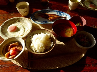 というわけで宿に戻ってきたのは18:00過ぎ。「夕食は18:30くらいからです」といわれていましたので余裕でクリアです。部屋に戻ってしばしくつろいでいたところで夕食準備OKとのことで食堂へ。 |