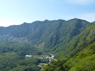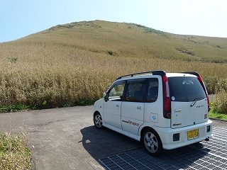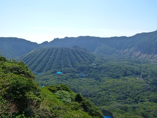 この方向からの丸山=内輪山は植栽を含めて縦にきれいな感じですし、最高部の(午前中に行った)大凸部もきれいに見えています(両上画像ともマウスオンで拡大。ただし左上画像の大凸部は手前の山ではなくその奥の平たい場所です)。