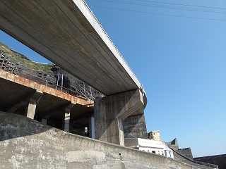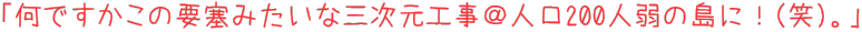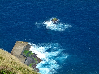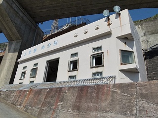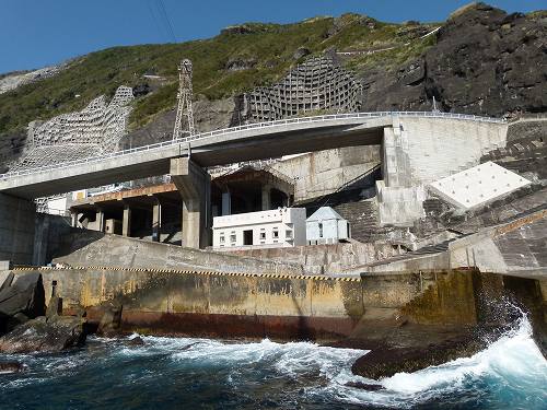 いや、わたしはあくまで青ヶ島における事業に否定的ではないのですが、それにしてもこの威容にはたまげました!まるで要塞です。しかも真ん中に見えている建物は「大自然との闘いに敗れた」廃墟なのですから!