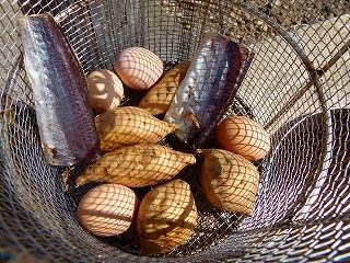 釜の中には網カゴが入っていますので、左上画像のようにいろいろと入れた上で釜の中に入れるわけですが、実際には左上画像のように‥