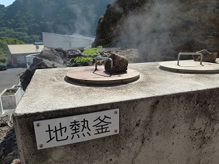 何と、噴気を利用した「蒸し釜」を自由に(もちろん無料で)利用できるのです!中里の女将さんからは「お芋は40分、卵と魚は10分だからね」とご教授いただいていましたんで、ここでまずは芋を投入しておき、蒸し上がる間に三宝港へと遊びに行こうという算段なのです。ではこの地熱釜についてもう少しご紹介いたしましょう。