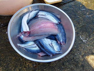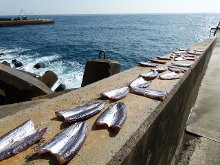 で、この日は港がこれでも穏やかだったので島の方々も工事関係の方々も絶賛作業中。春トビを剥いて干している方もおりました。実は左右画像の持ち主は別の方々なのですが要は同じことをやっていたわけで‥。
