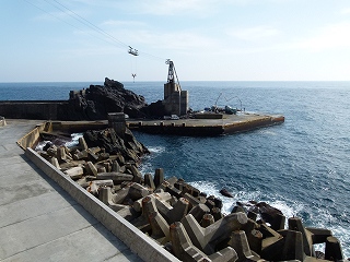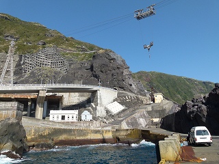少し遠景から。中空にあるのは「漁船を釣り上げる」索道。この島では漁船も空を飛びます。