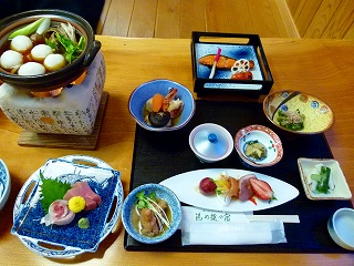 | どこかで聞いた話では、こちらの宿の経営者さんはこの地元出身で、一代で会社を興して財をなした成功者(苦労人ともいうのでしょう)なのだとか(後述)。それでもこうして地元を忘れずに宿を建て、地元の方に「いいお湯」を提供し地域に貢献しているところに好感です。 で、いいお湯を求めて地元の方々がひっきりなしにやってきますんで「こりゃお風呂は満員御礼状態だぞ」と、夕食前の入浴はあきらめました(笑)。1回入浴は20:00で終了ですが宿泊客は22:00までOKですのでね。そんなわけでお風呂画像の前にいきなり夕食となります(笑)。 |