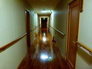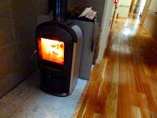 隠密行動ですから廊下も静かにね(笑)。ちなみに宿泊棟の廊下は合板のようでしたが、エントランス付近まで来ると無垢の杉板?に変わります。ただ板が収縮しているのか歩くと結構ミシミシいうので隠密行動には不向きです(笑)。 この夜は比較的冷えたからかしっかり暖炉に火が入っていました。いいなぁ我が家もいつか(無理だって)。でもTakema家の数軒先には、街中なのに暖炉のある家があるのをわたしは知っています(笑)。 |
