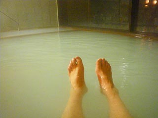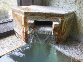 ちなみに湯口からはややぬるめの湯が少量流し込まれていました。これが源泉そのままなのでしょうか(H15の検査によると源泉温度は40.5度とのことなので)。と、こちらの湯口はダミーという話もありますのでお気をつけあれ(浴槽湯をくみ上げて出しているだけかも)。なお右上画像マウスオンで小浴槽での湯足画像に変わります(色合い的にはこっちの方が映えますね)。 |