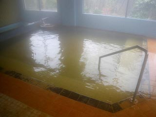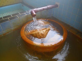 かなーり黄色みを帯びた湯で、泉質はナトリウム強塩化物泉。なお以前は湯温が40度を切っていたみたいですが、今は47度台の源泉とか?(掲示の記憶はないのですがネット上の情報にその旨の記載あり、ただし公式サイトには一切記載なし)。 で、右上画像なんですが「高温湯を少しでも空冷するための苦肉の策‥」というわけではありません。実はこの中に入れられているのはラジウム石なのだそうで、湯に溶け出したラジウム成分が云々ということなのだそうです。どこかで似たようなコンセプトの湯に入ったなーと思ったら、青森は小川原湖近くの八甲温泉でありました(その時のページはこちら)。で、いざ湯に浸かってみると‥ |