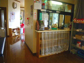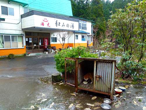 はいはーい、これまたごく一部のディープな方々にはたまらない必須の存在「温泉犬」もいる「和みの湯」へと到着です(わたし個人としてはは「温泉猫」のほうが好みなんですが)。 ガラケーで調べた事前情報では(ちなみにバッテリーの保ちが今レベルなら買い換えるつもりなし)以前は「藤駒荘」という名前だったらしく、源泉は湯の沢温泉1号泉で湯温は38.5度のぬる湯系です。ちなみに上でも書いたとおりこの日は気温が低く(最高気温は7度くらい)、けっこう寒かったのでどうなることやら。なお、おしんこどんはわずかな移動の間に「嗚呼いつものバトルロワイアルモード=眠々バトル」に突入してしまったんで、ここの湯はTakemaのみでの突入です。 |