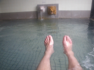 左上画像のW浴槽は手前側が源泉浴槽、奥は加熱浴槽です。となれば間違いなくぬるい源泉湯の方に浸からざるを得ないのが嬉し悲しい性であります。でも、ぬるいとはいえそれに浴する?嬉しいお話が!それは‥ |