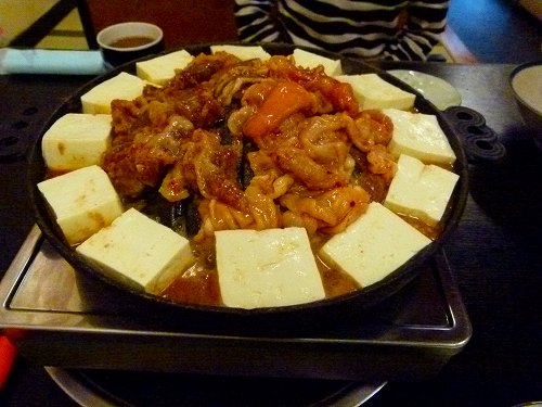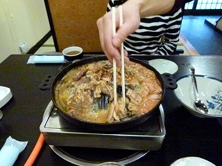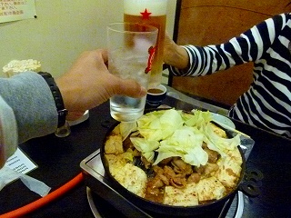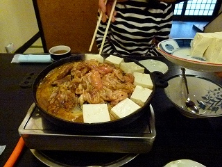 | さてホルモン&焼肉各一人前+豆腐を注文してしばし、それぞれがやってきました。で、こちらではホルモン鍋で煮込み系が基本なのですが、最初のセッティングはお店の方がやって下さいます(われわれが初心者だったからかも知れません)。 |