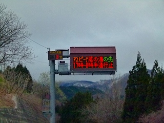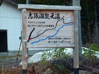 でもね、ぐいぐいと冷えてきましたよ。左上画像をよく見ていただくとわかりますがこの時の(夕刻の)気温で3度ですからね。しかもこのあと、ここ秋田県の脊梁部近くはしばらくとんでもないお天気が続いたんです! しかしまぁ、何とか暗くなる前に志張温泉元湯に到着です(右上画像はまだ入口手前ですが)。数年前に「復活」した湯宿、かなーりいい感じでありましたがその詳細については次ページにて。 |