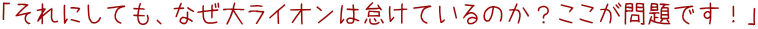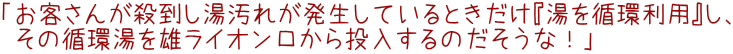 左側の小ライオン(雌?)が、顔全体を真っ白にしながら日々労働にいそしむ中、大ライオン(明らかに雄)は何ら仕事もせずにのーんびり。実際、アフリカのサバンナなどでも「狩りをするのは雌たちの仕事」らしいですが、その野生の習性をここ釈迦内温泉でもしっかり体現している(させている)ということなのでしょうか? と、このことについて生態学的見地から温泉ファンのサイトを調査していたら興味深いデータが得られました(何のこっちゃ)。ここ釈迦内温泉で雄ライオンが「仕事をする」のは結構「ヤバイ状況」においてなのだそうです。それはつまり‥ |