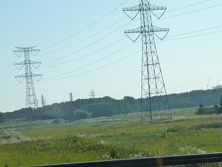 道路標識からすると左上画像の交差点を右折すれば福島第一原発に至ると思われます。この交差点エリアから原子炉建屋までは直線距離で2.5kmもないはずです。もちろん立ち寄りが許される身でもないのでそのまま通過しましたが、この送電線の奥に見えているのは福島第一の施設なのだろうなぁと。 |